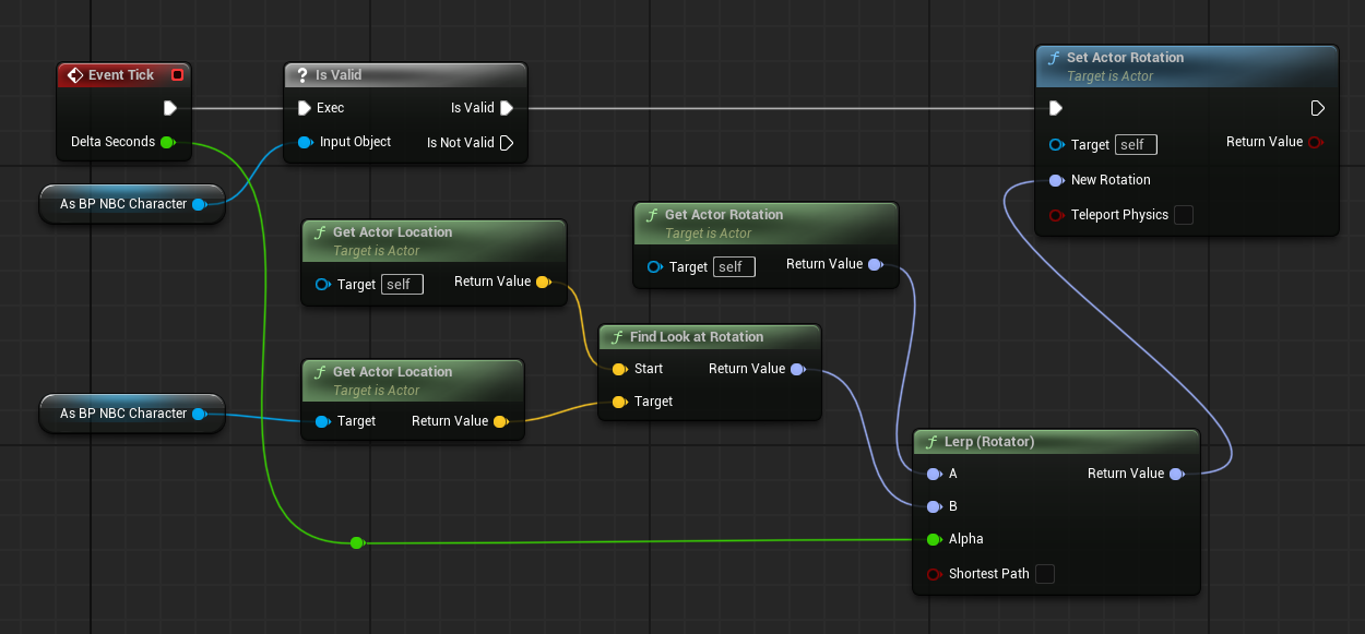 변수에 캐릭터 있는지 체크 > Find Look at Rotation을 통해 타겟(캐릭터)을 찾도록 회전 > Lerp(선형보간)으로 부드럽게