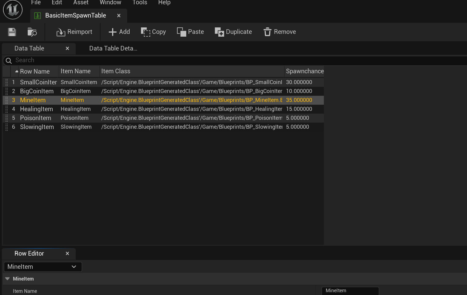 데이터테이블에 새로 만든 아이템 두개 추가해주면 이제 랜덤으로 스폰한다.